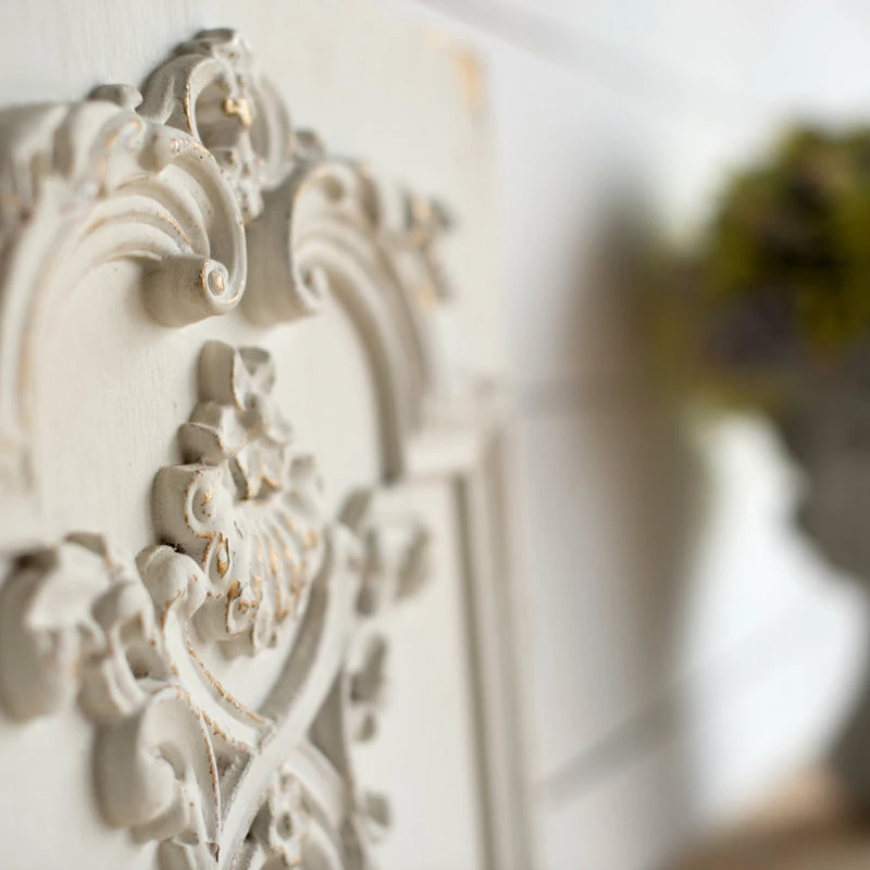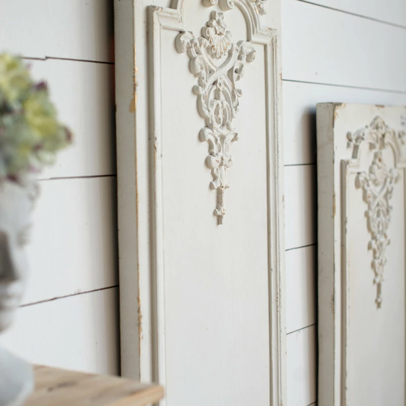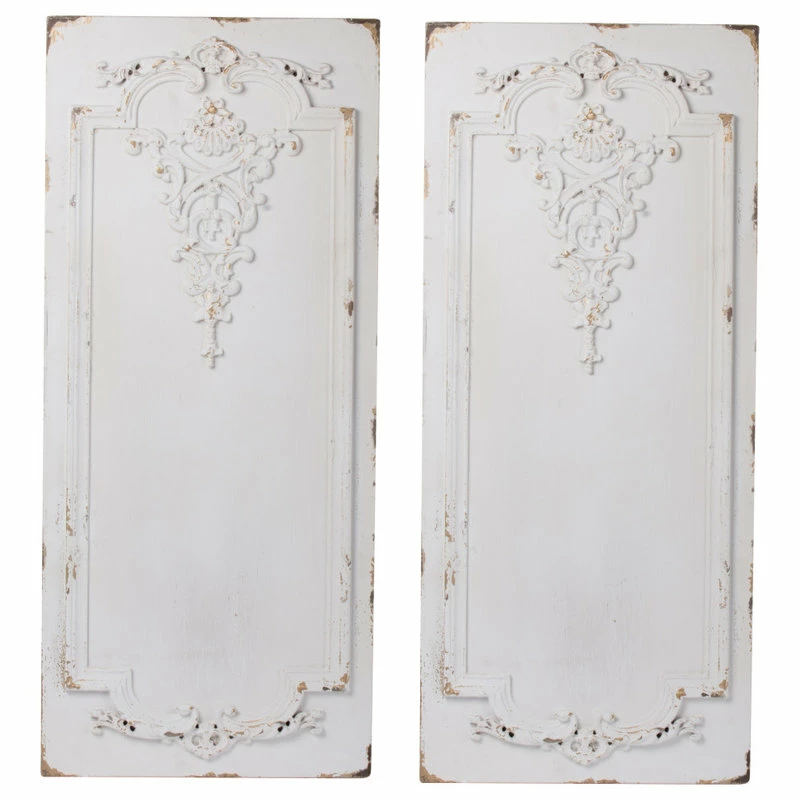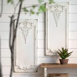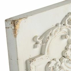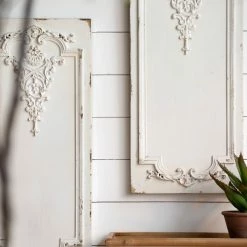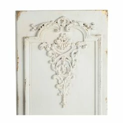 Inspired by ornate boiserie designs, this pair of Prasoon Wall Panels instantly enhances the elegance of any space. A simple white finish gives way to a weathered textural effect, giving a timeworn appearance that makes each individual panel one-of-a-kind. Experiment with spacing to find the arrangement that best works for your space.