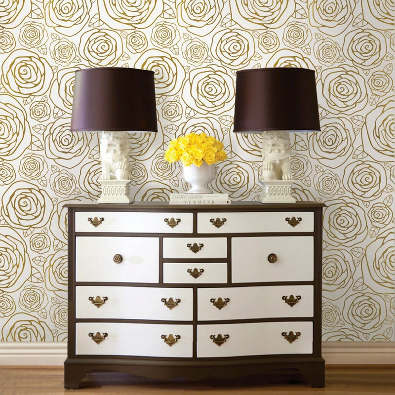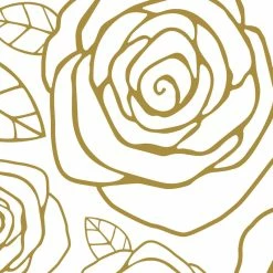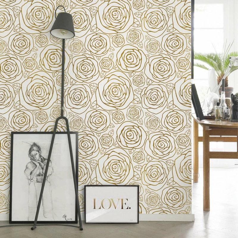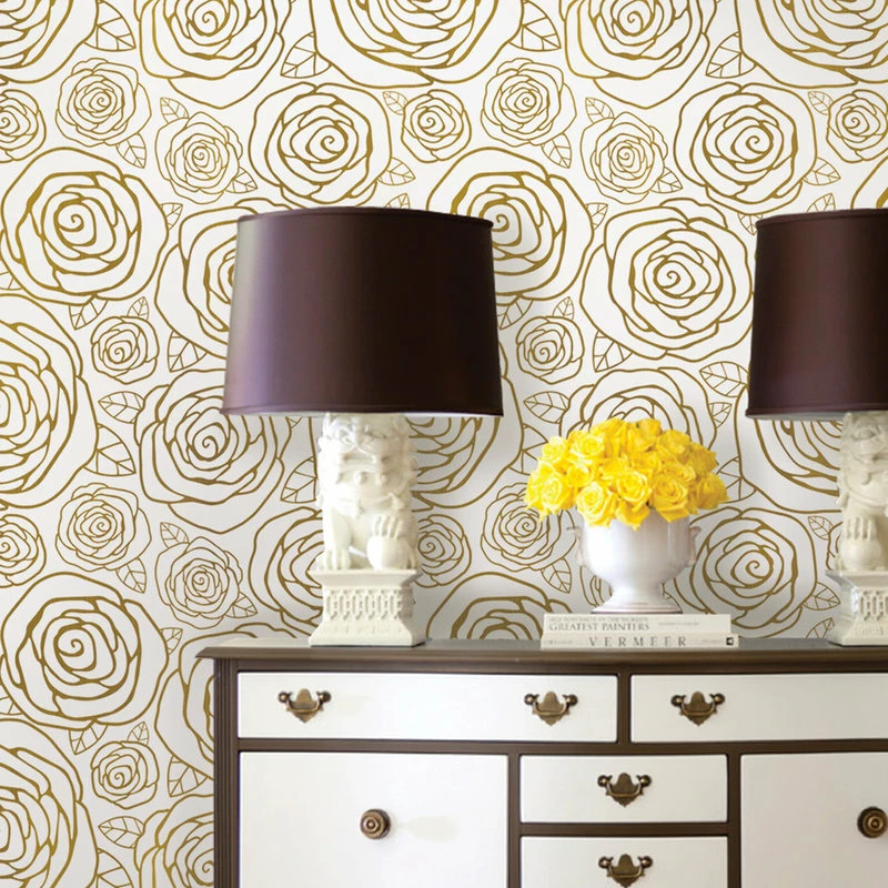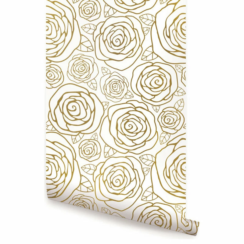 This modern floral Peel-and-Stick Wallpaper features large and small roses with spiraling centers. Use it to add elegance to an accent wall behind a makeup vanity, or to brighten up the inside of a closet. Please note that the Gold color is not metallic.