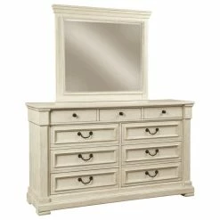 Made with Acacia veneers and solids finished in a trendy textured antique white color. French/English dovetailed drawers feature fully finished drawer boxes and metal ball bearing side glides. B647-57 and -58 shelter styled panel headboard has lattice design headboard panel. B647-77 and -78 shelter styled panel bed features a louvered headboard panel. Cases feature framed drawer fronts, break-front pilasters and profiled base mouldings for added dimension. An accent night table features door cabinet storage with an AC power supply and USB charging ports for powered devices.