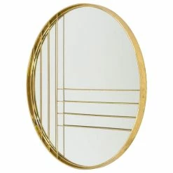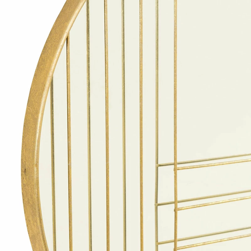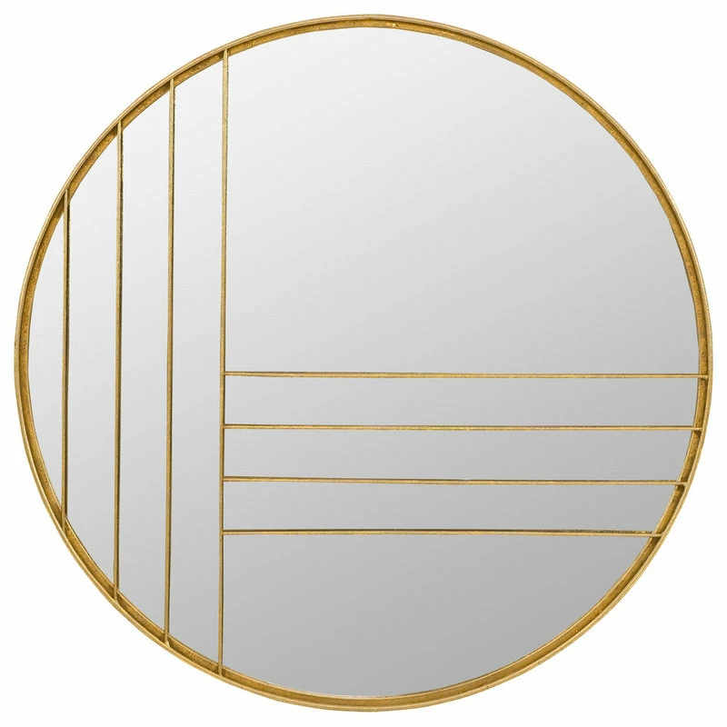 Exuding mid-century modern flair, this metal wall mirror features sleek geometric accents. The line details add visual interest and glimmer in the light. Treated with gold leaf finish, itβs a perfect piece for any modern space. Use it in a gallery wall, hang it above your mantle, or as a bedroom accent.