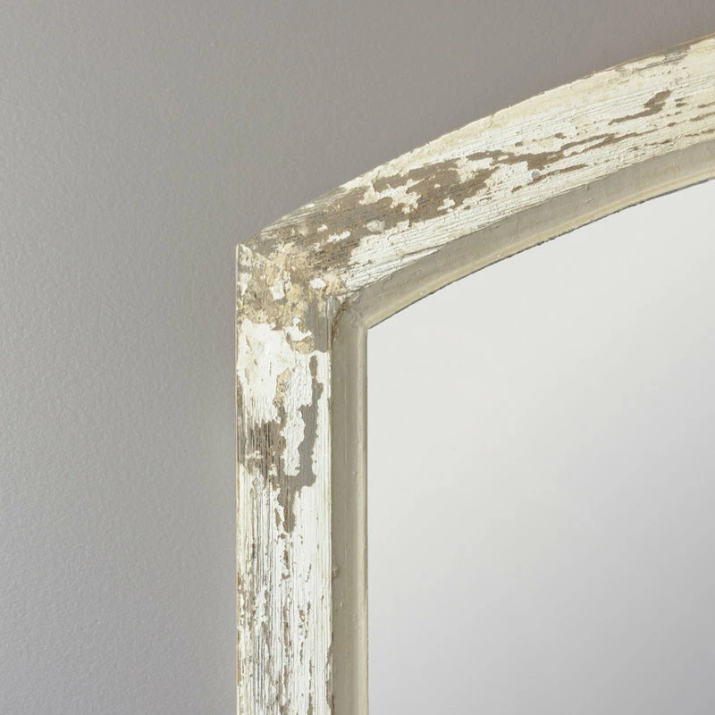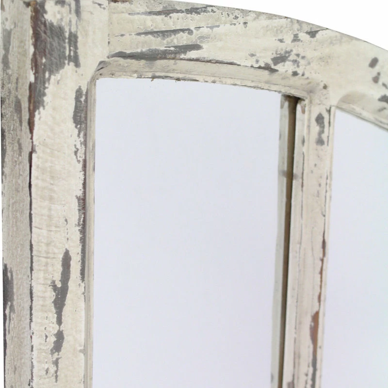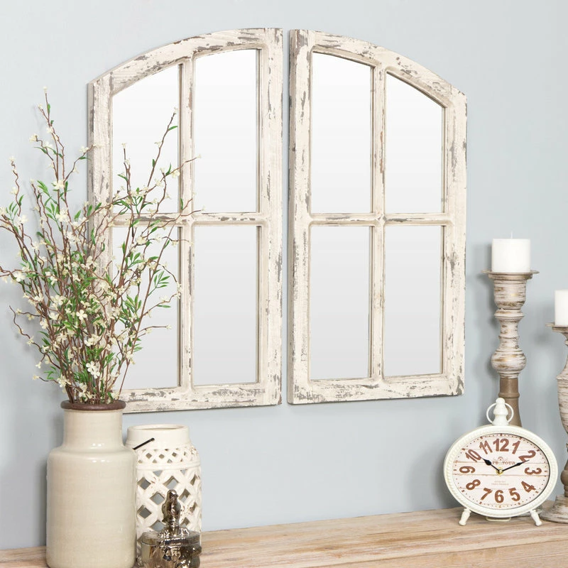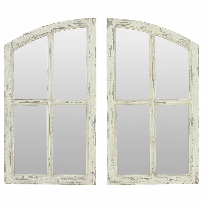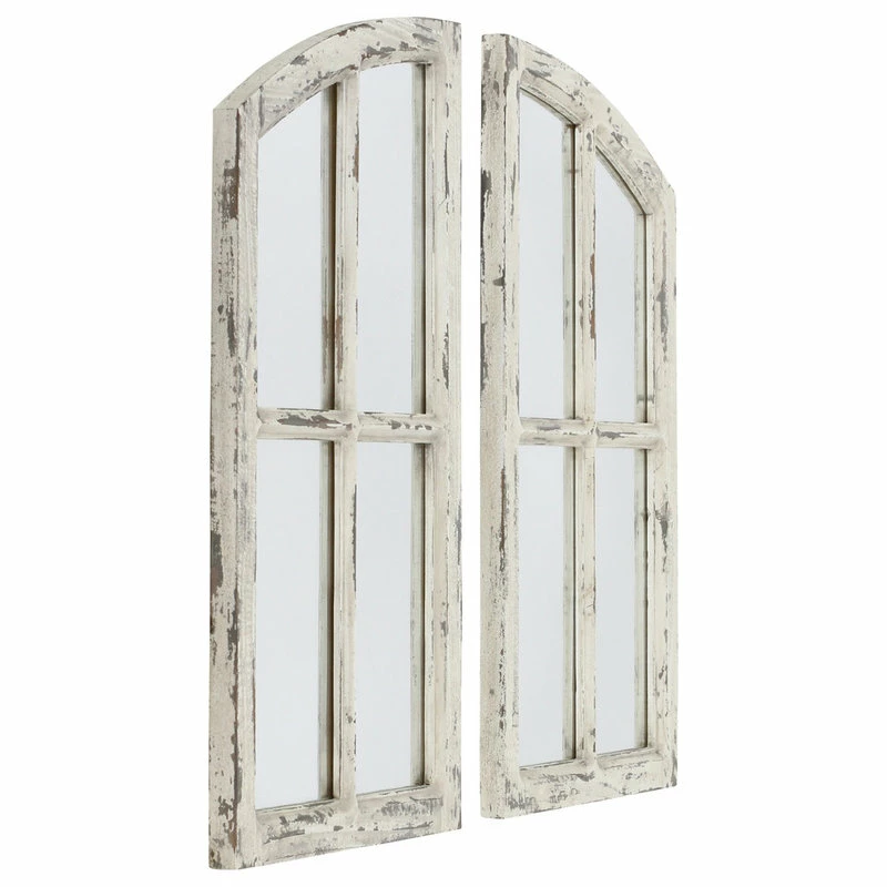 Enhance your foyer or living space with this lovely set of arch windowpane wall mirrors. Crafted from wood with a heavily distressed off-white finish. You’re sure to love these mirrors as they add charm and enlarge the feel of your space. When hung together as shown, this wall feature measures approximately 32 inches wide.