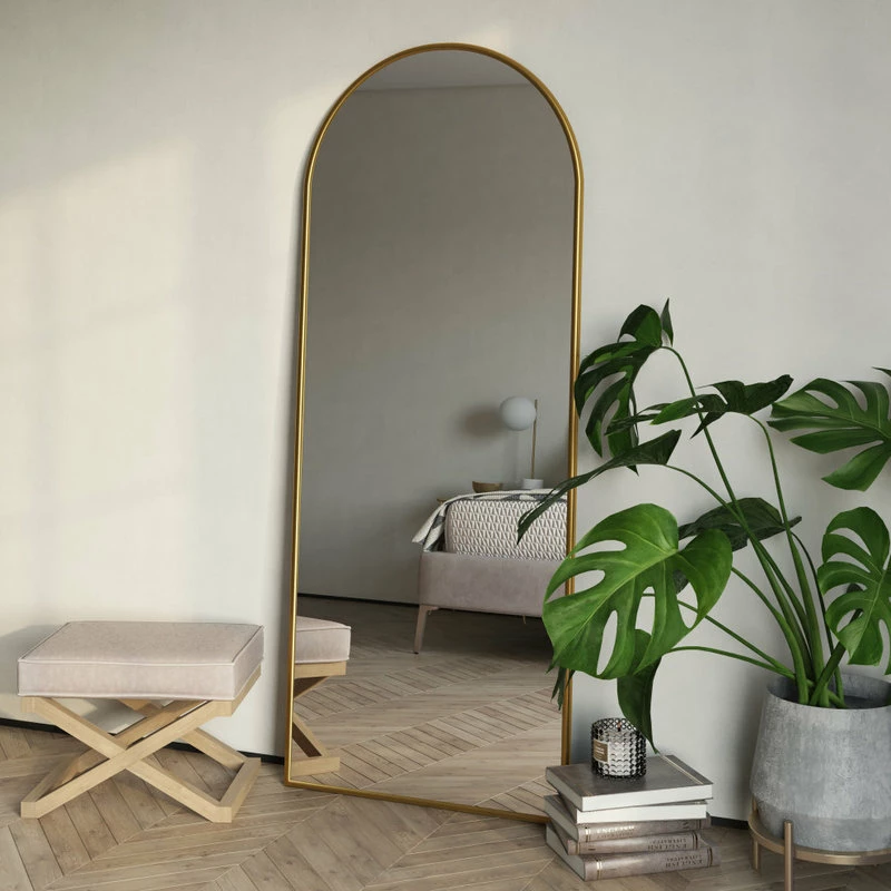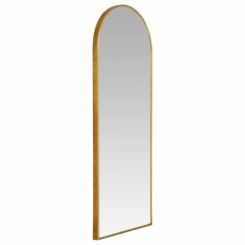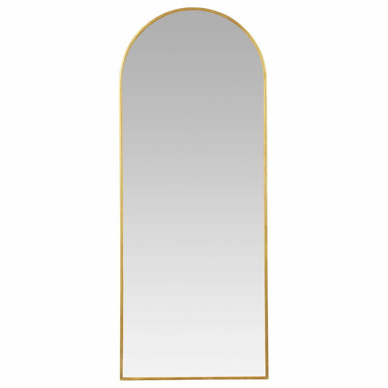 This metal floor mirror features a modern arch design, with its graceful curves a winning accent for any living room, office, or bedroom. You may lean it against the wall or hang it as an accent. Incorporate it into a gallery wall to tie together your creation. The sleek metal bears a gold finish and will add a shimmering touch to the space no matter how you place it. It pairs well with Hollywood Regency, mid-century modern, glam and even modern farmhouse decor.