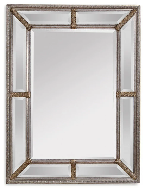 The Roma Wall mirror features an rope motif on the inner and outer moulidng finished in a antique silver leaf. The center mirror is beveled along with each individual mirror tile. This is designed to hang horizontally or verticallyFeaturesFinish Ant Silver LeafMaterial Wood Product Size 37″L x 49″HMade in China