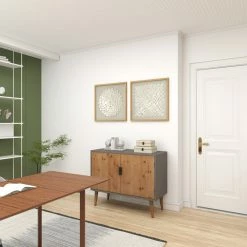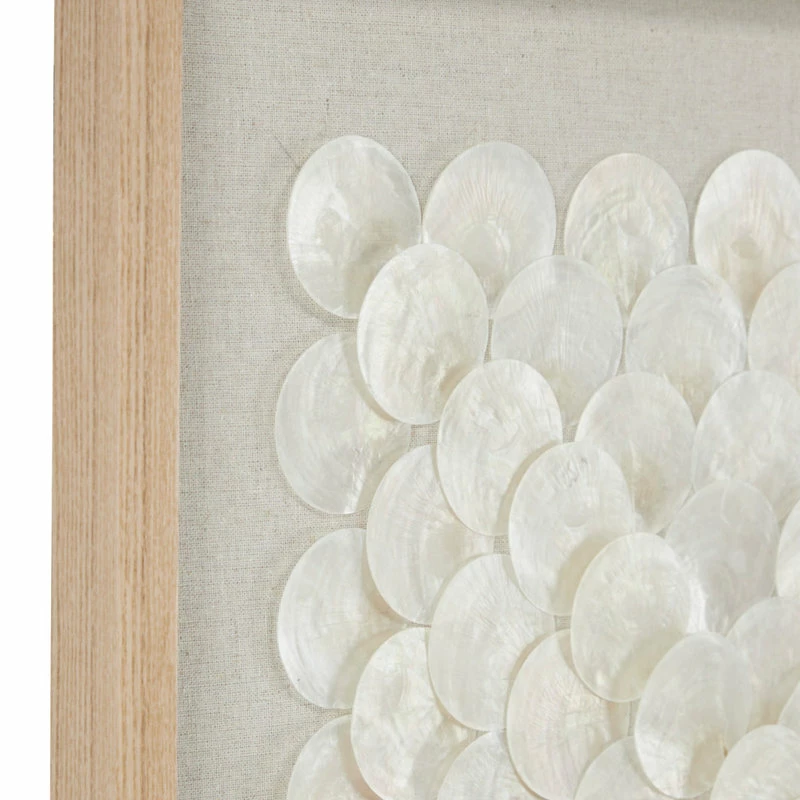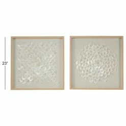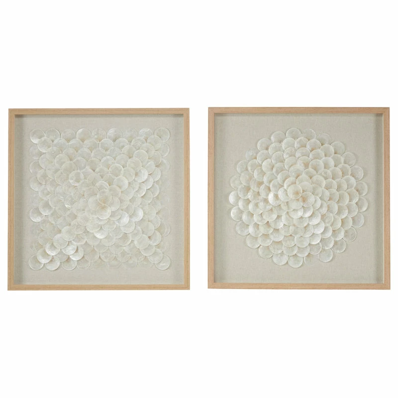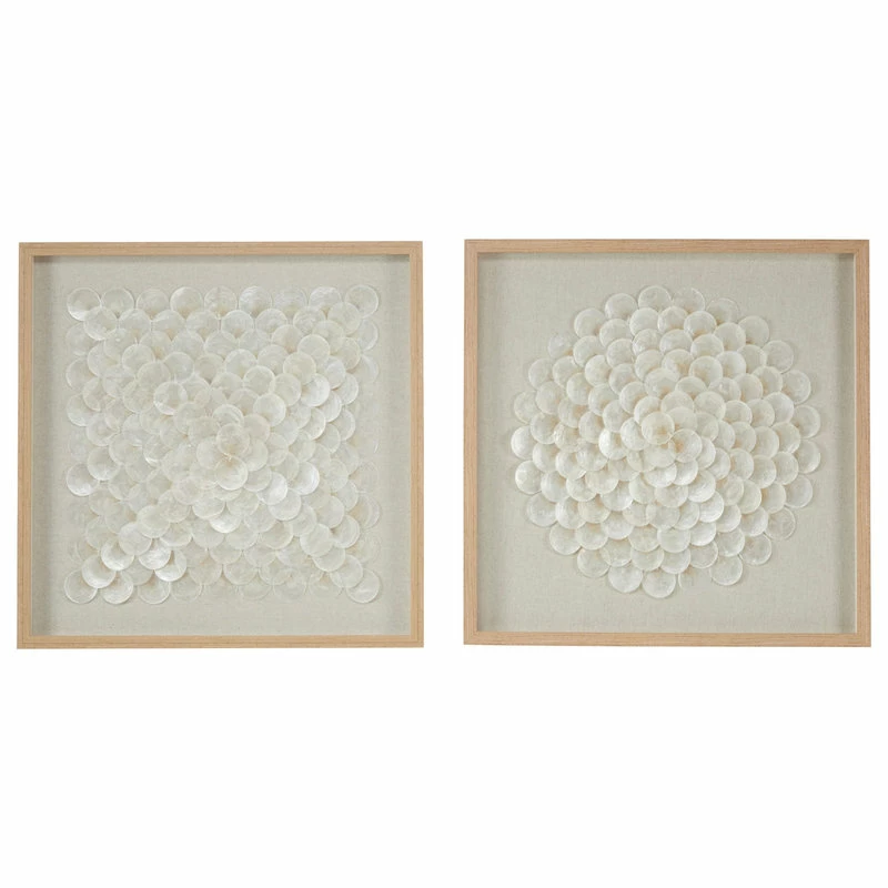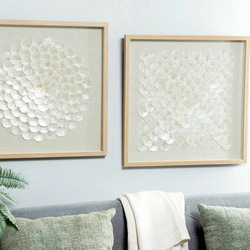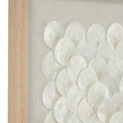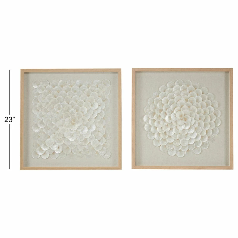 Elevate your home with this shell wall art that are both timeless and delicate in color and design. This item ships in 1 carton. Geometric radial and square wall art with textured, wheat beige linen backs, each with round, white, luminescent seashells, frames are distressed to create a wood-like texture. Due to the handmade nature of this item, no two will be alike, there will be slight differences in shape, size, and color. Ready to hang with attached D-ring hook; nails and screws are not included. Suitable for indoor use only. This shadow box comes as a set of 2. Coastal style.