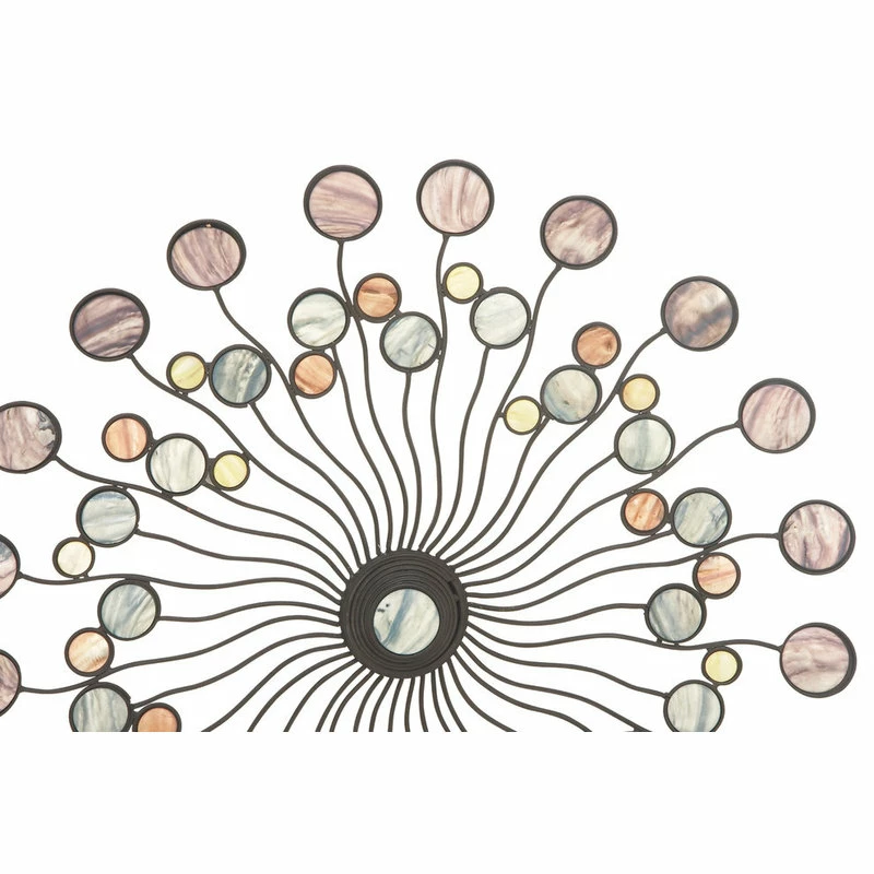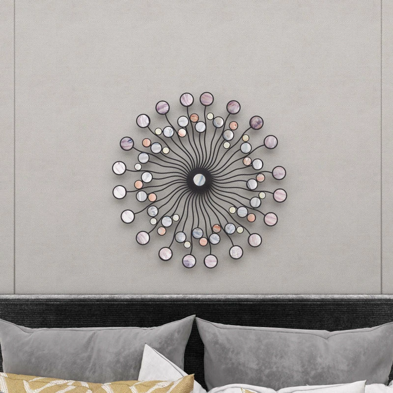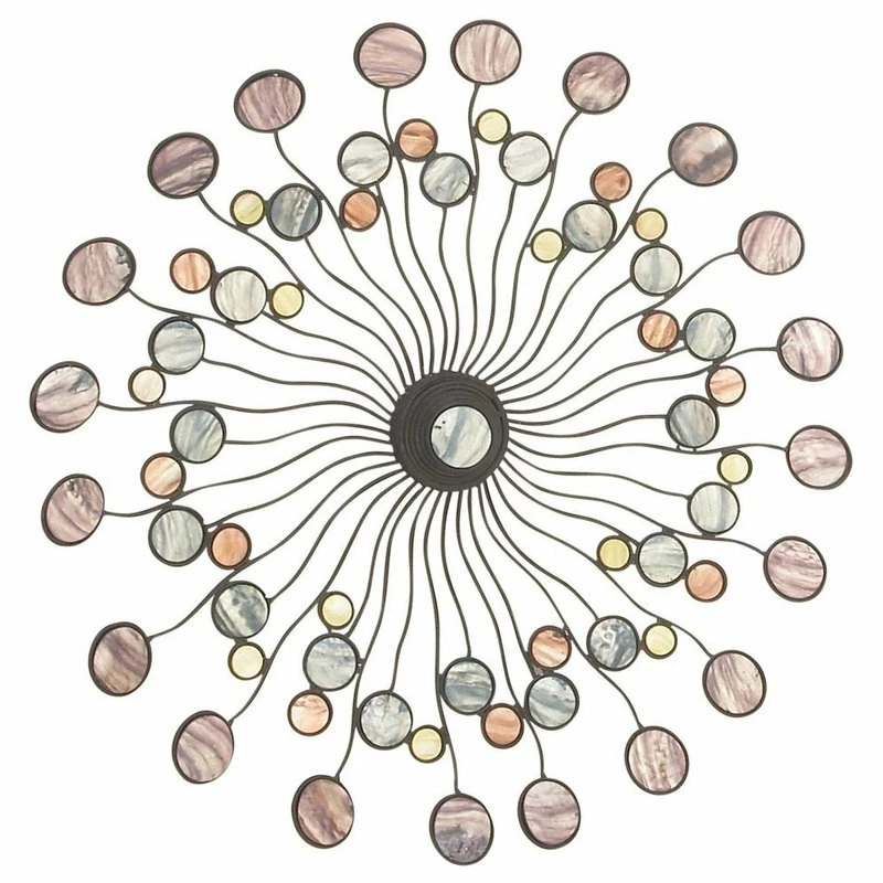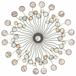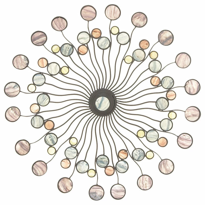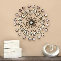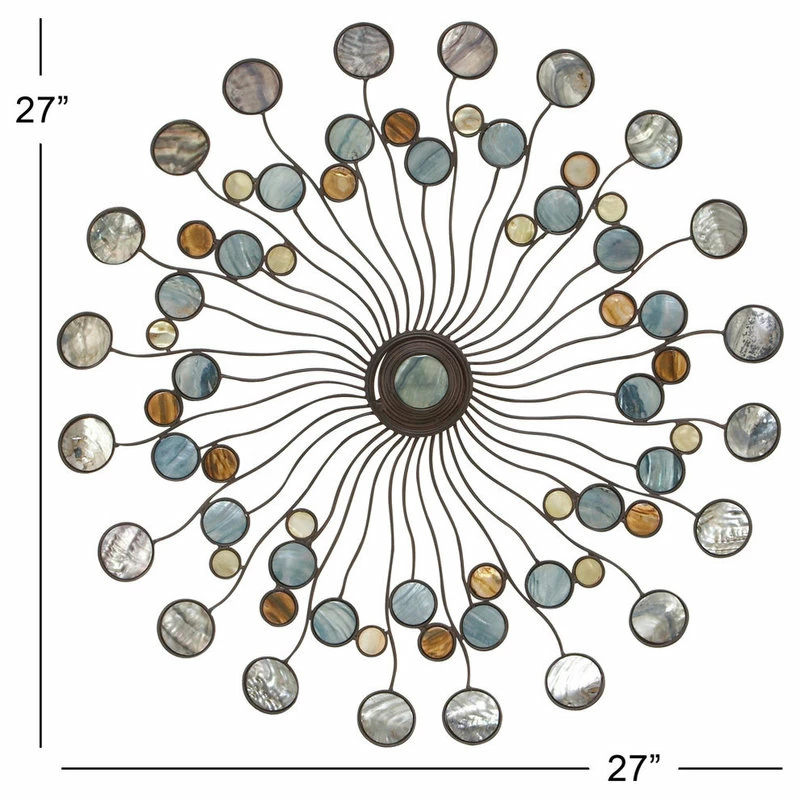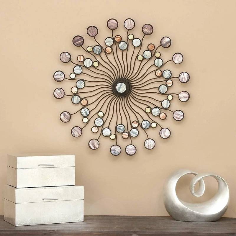 Place over a console or couch near natural or overhead lighting as a luminous, lively centerpiece. This item ships in 1 carton. Large radial metal wall decor with colorful textured shell accents. Easy and ready to hang by keyhole hook in back; nails and screws are not included. Suitable for indoor use only. This is a single wall decor. Modern style.