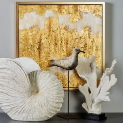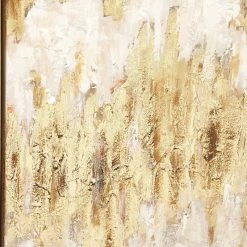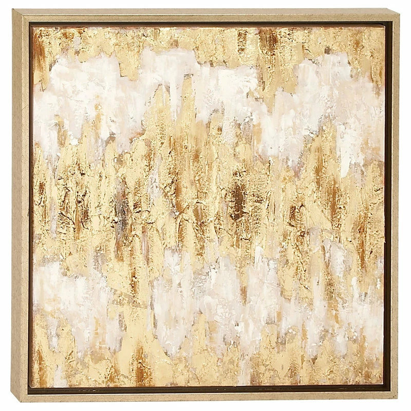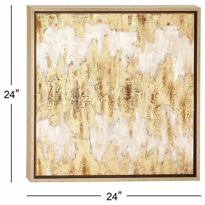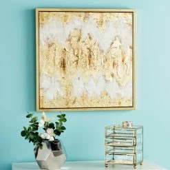 This wall art exude natural beauty and sophistication in both color and composition. Showcase your personality and turn your walls into an art gallery with this impressive wall art. Hang this abstract painting canvas wall art as a focal point above a piece of furniture in your entryway, living room, bedroom, or dining area. This item ships in 1 carton. Square gold frame housing an abstract metallic gold acrylic painting. Easy to hang by sawtooth hook in back; nails and screws are not included. Suitable for indoor use only. This is a single framed wall art. Glam style.