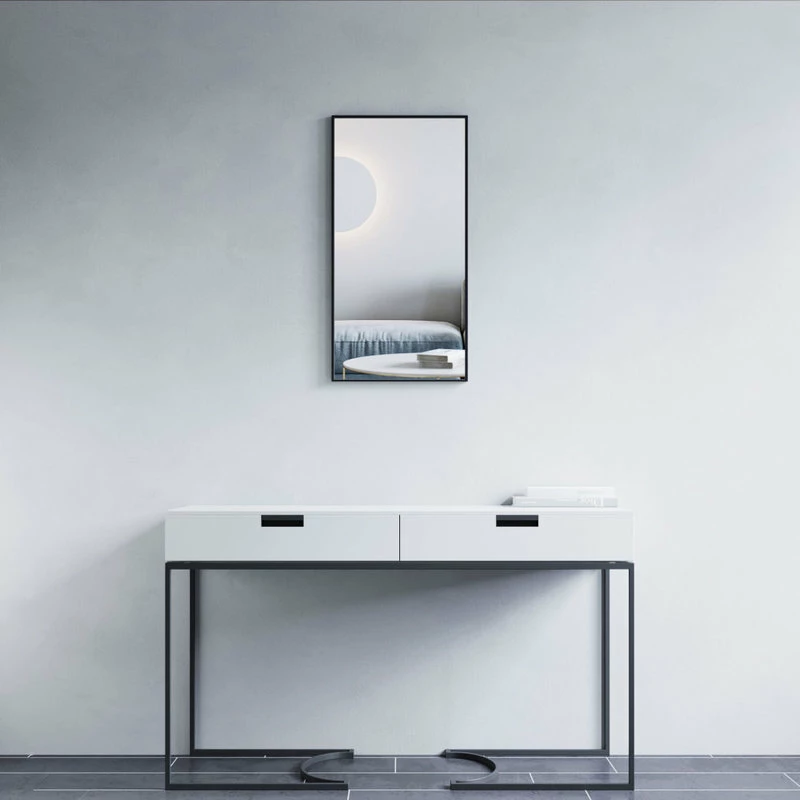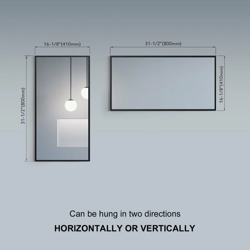 Wall-mounted rectangular mirror with metal frame is available in Black, Gold, and White. These 31-1/2″ tall mirrors are available in 16″, 24″, 30″, 36″, and 48″ widths.