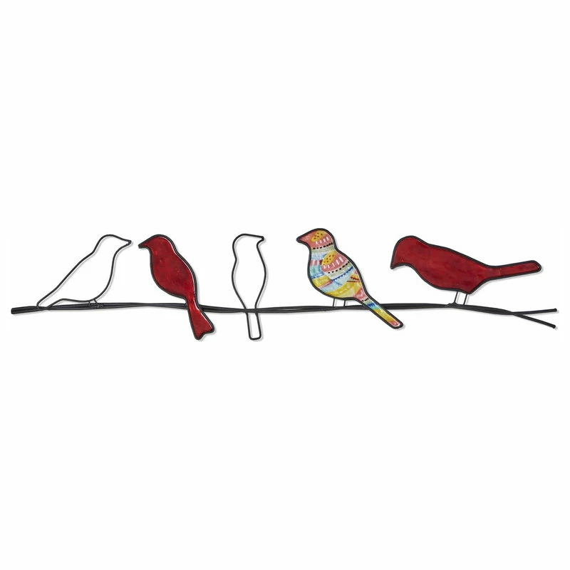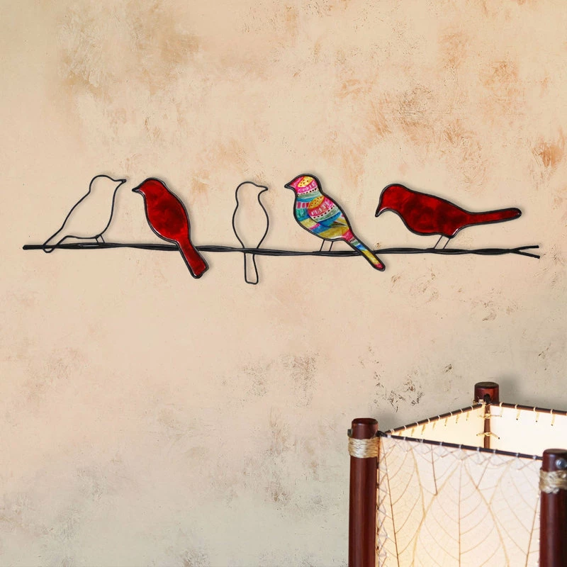 An old parable states that five birds were resting on a wire. Two decided to fly south. How many were birds are left? One’s initial answer may be three, however, the answer is still five. The moral of the fable is actions are more important than intention; a kind reminder that a truer picture of one’s character is drawn by actions. The artisan captures this parable by lining up five birds socializing on a wire.