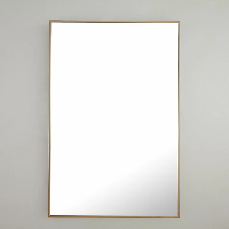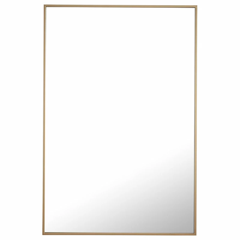 Vertical or Horizontal? The option is up to you! This inter-changeable mirror can be hung either way. With exquisite lines, this rectangular mirror adds a beautiful classic touch to any room in the office or house. Its thin brass-colored metal frame provides a minimal design allowing it to accent any area. It is secure and easy to hang up with a welded metal hanger bar on the back of the metal frame. Measurements: 24 inches width by 42 inches height