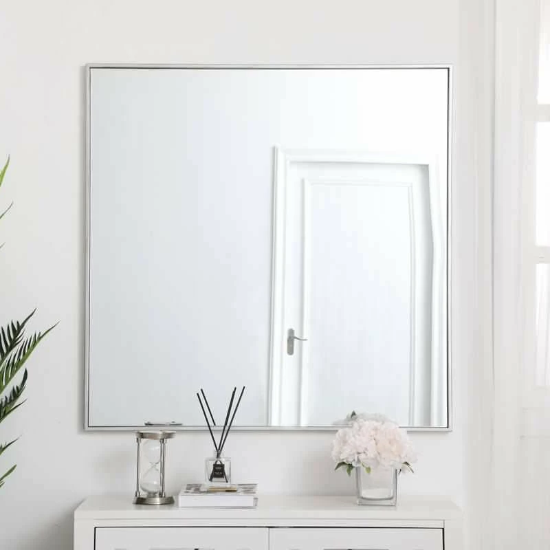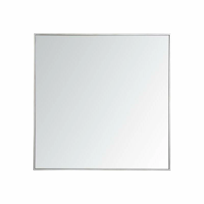 Metal frame square mirror 36 inch in silverAdd elegance and simple form into your home while expanding visual space. This versatile mirror can be oriented as a square–or even a diamond if you’re feeling daring, and its slender metal frame comes in a black, brass, or silver finish. This mirror offers you a plethora of design options–whether it overlooks your home in the foyer, bathroom, or bedroom, its stylish modernity will please all.
