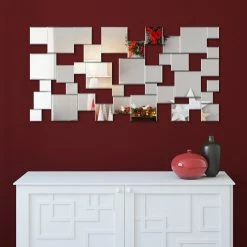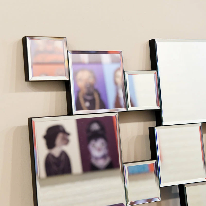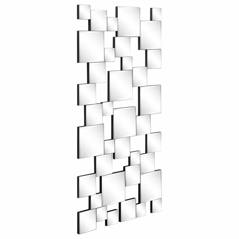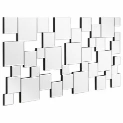 This Mirror is a stunning piece. mirrored squares are arranged in an offset tiled pattern. Each mirrored squared on this piece has a small bevel adding to its beauty and style. This stunning piece would be a great addition to any room. Alone or in multiples, it is a perfect focal point for an entryway, bathroom, bedroom or any room in your home. 4 Hooks are affixed to the back of the mirror so it is ready to hang right out of the box in either a square or diamond orientation!