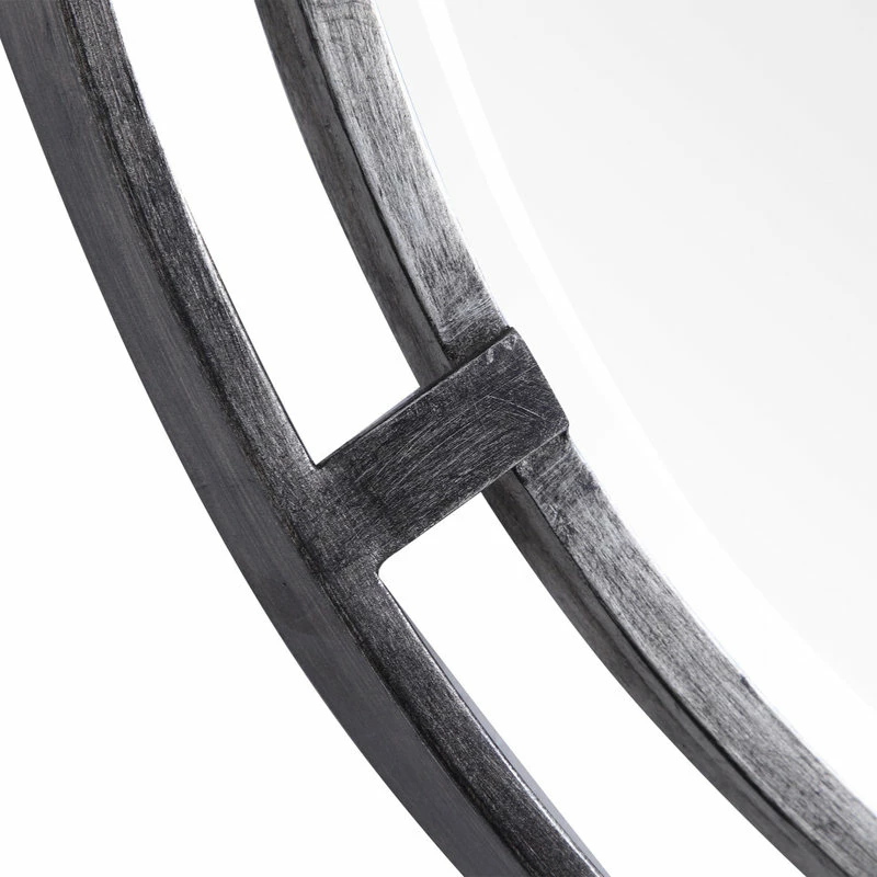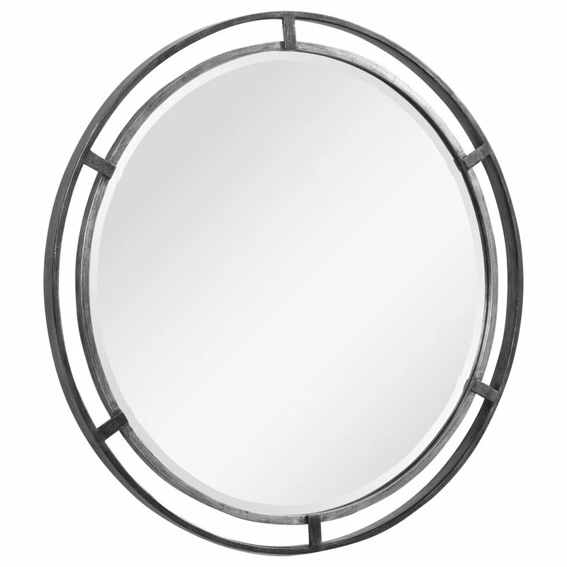 This iron 3-dimensional design features an outer frame, finished in a dark silver and connected to a center, finished in a complimentary lighter silver. A 1″ bevel completes the look.