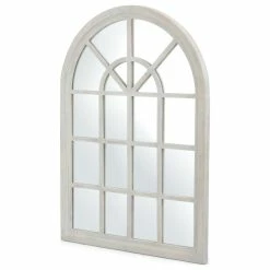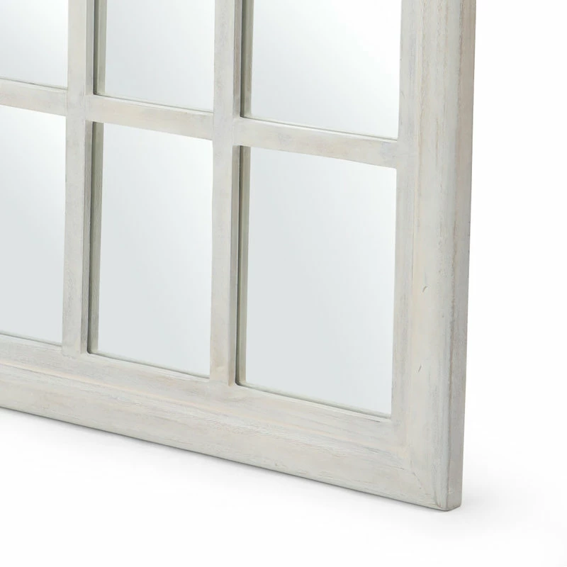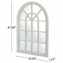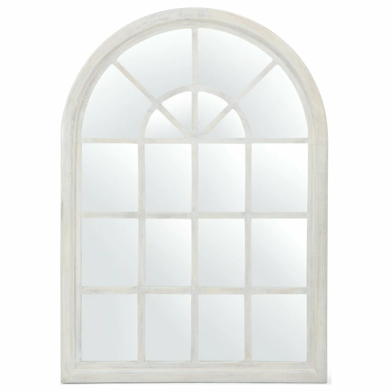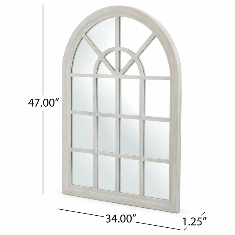 TRADITIONAL: With a true arch sunburst design and slender cottage muntins, our windowpane mirror brings a regal style to any interior space. The washed frame emphasizes the traditional elements of the piece, giving your home a sophisticated and ornate atmosphere.