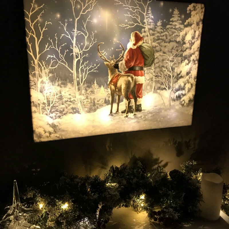 SKU: GLOW1807 Categories: Prints & Posters, Wall Decor Tags: Art by Dona Gelsinger, Backlit print, Christmas decor, Christmas Wall Art, Home decor, LED wall art with timer and remote, Made in the usa, Reindeer, Santa, Starry Night, Winter scene