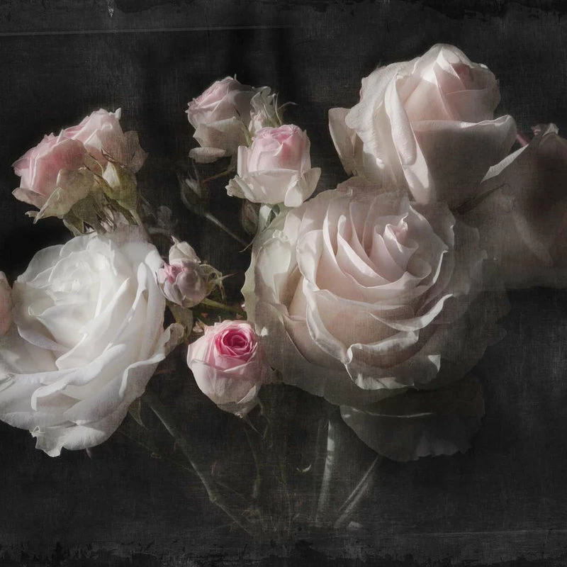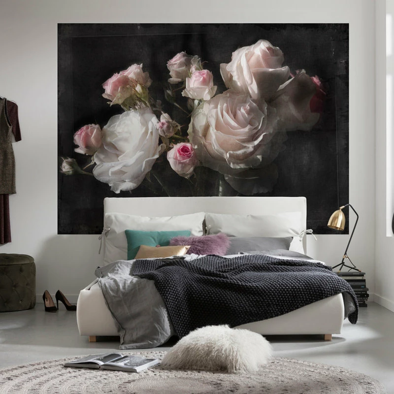 Dark tones and a distressed texture tempers the delicate nature of roses. This floral mural is striking and modern. Printed on vinyl coated paper; Paste included; Comes with 4 panels; Measures 8ft 3in x 6ft when assembled.