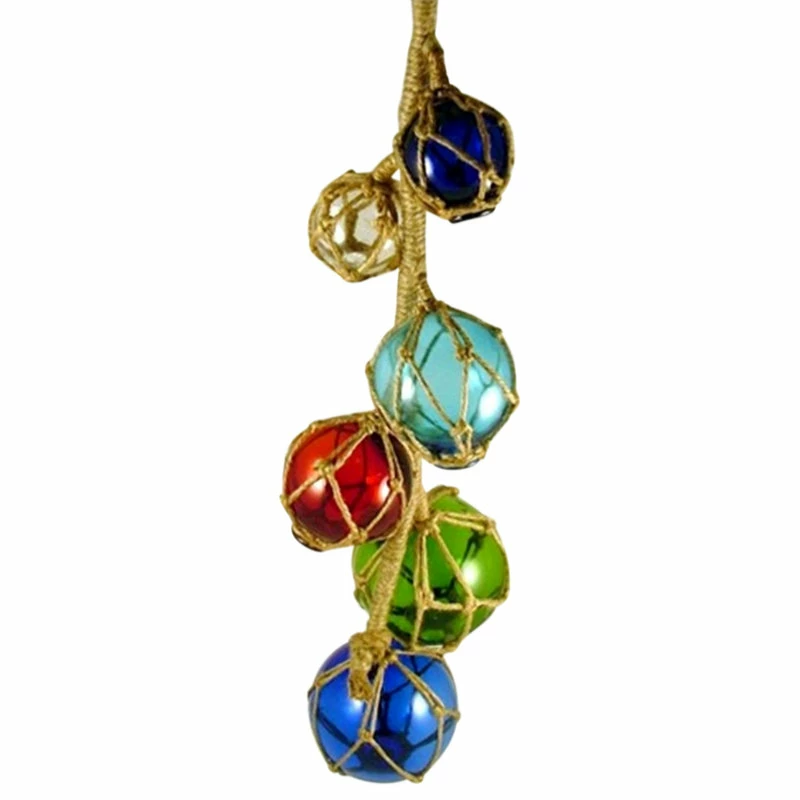 Glass floats, glass fishing floats, or Japanese glass fishing floats are popular collectors items and a must have for any nautical decor. DECORATING IDEA: The second photo was sent to us from a customer in Utah. She had a glass shop drill a hole in the bottom of each float and added a string of clear lights and hung the glass floats along the top of her tiki bar.. Measures 2, 3, 4 inches in diameter, 32 inches long. Made of glass with natural jute woven. Manufactured nautical replica