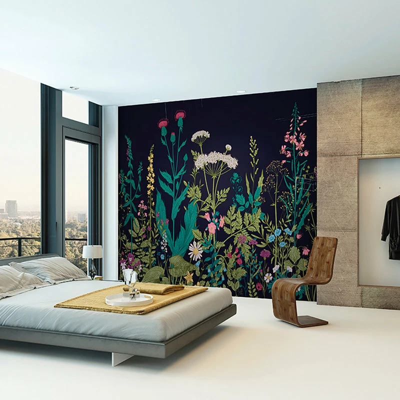 This botanical wall mural is a sight for sore eyes. Vibrant shades of teal, pink, purple, and green come together in a vintage floral illustration.