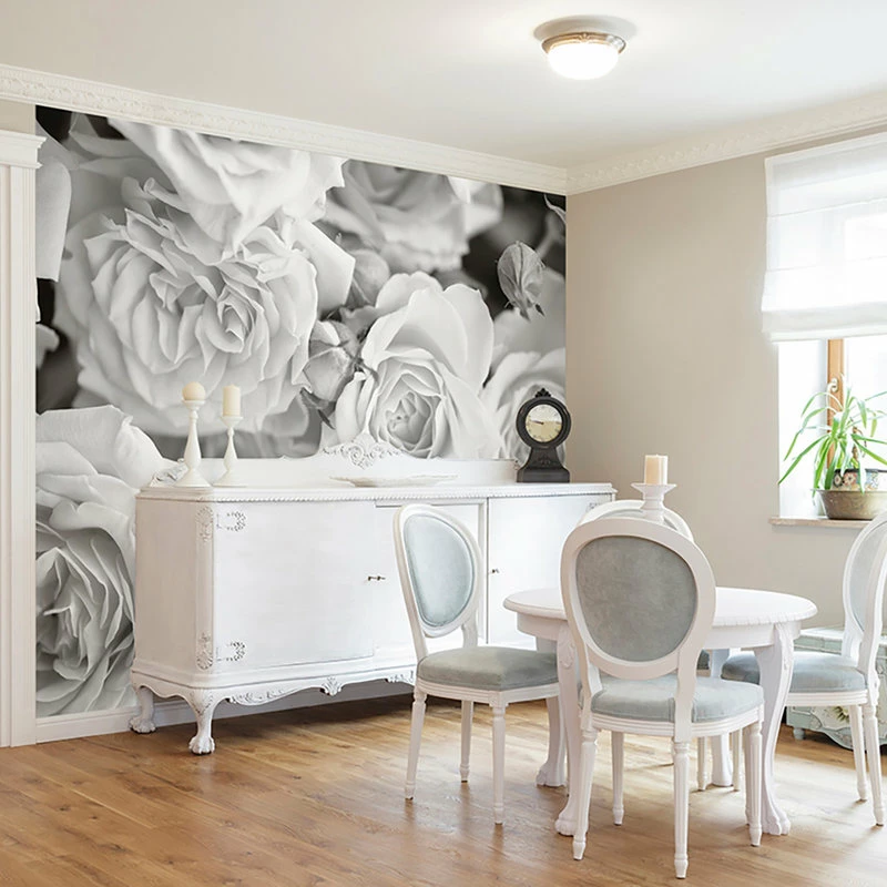 Create a romantic scene with this black and white rose mural. The large scale print is a stunning design.