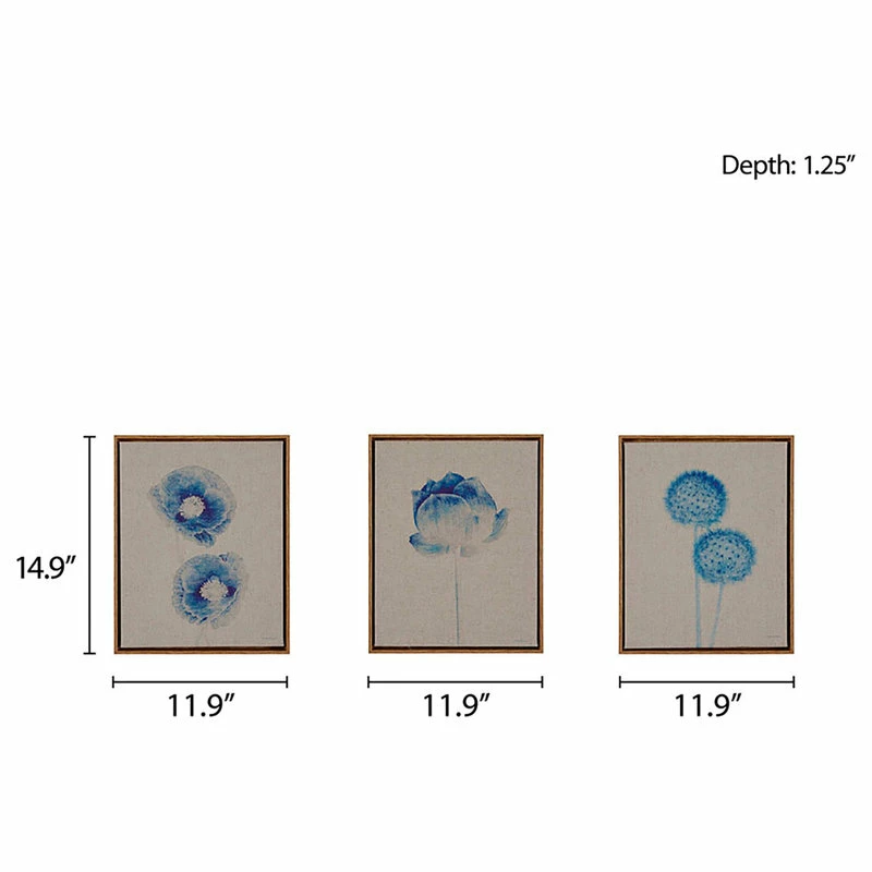 The Madison Park Blue Print Botanicals by artist Morgan Yamada, brings a soft and feminine touch to your home. This wall art set features unique floral prints in vivid blue hues on a linen canvas for a soft and vintage look, while the wood tone frame adds a natural touch complementing the canvas wall art. A saw tooth fixtures on the reverse of each piece makes them easy to hang and arrange on your wall to fit any space. Simply display this set together either lined up or staggered, or hang pieces separately throughout your home for a more stylized approach. Comes as a 3 piece set, each canvas piece measures 11×14″ and is spot clean only.