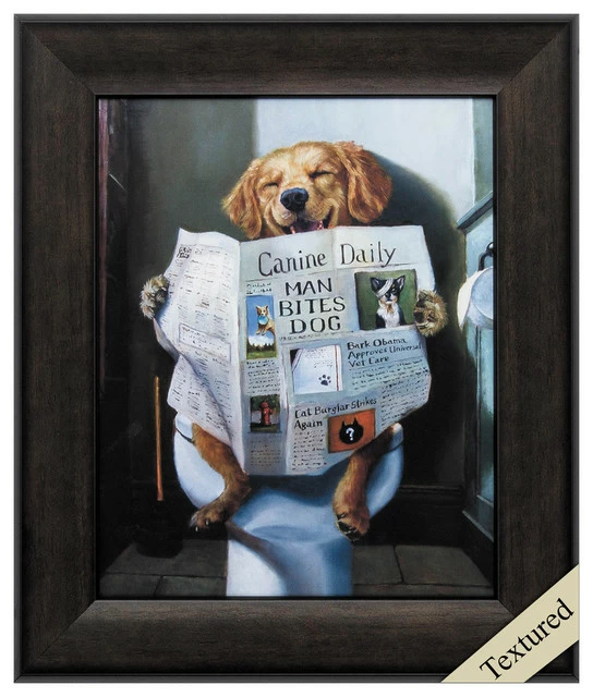 Fun and funky art and laughter is good for your soul! On this particular piece, an acrylic overlay has been hand applied. The acrylic dries with a textured feel and look. It is then framed to size without glass in a deep brown moulding. Comes ready to hang and was hand assembled in the USA!