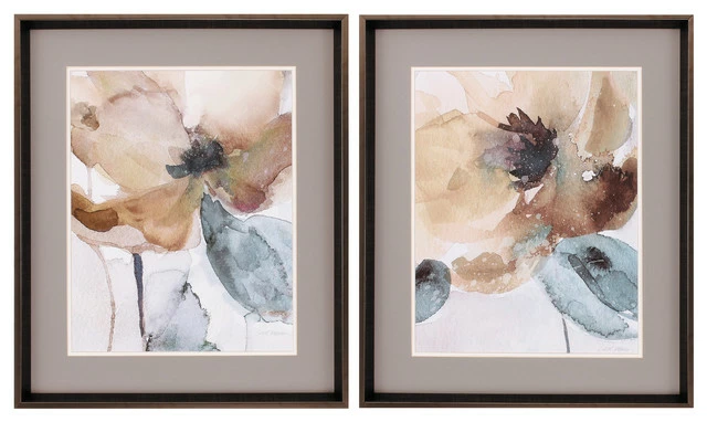 Set of two water color floral prints in muted browns and blues that are double matted in gray and white, framed under glass and finished in a complimenting frame. A gorgeous water color in soft muted tones for any room.