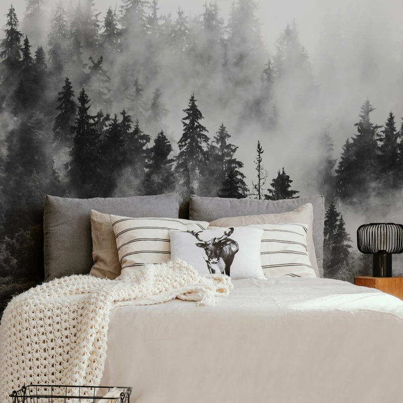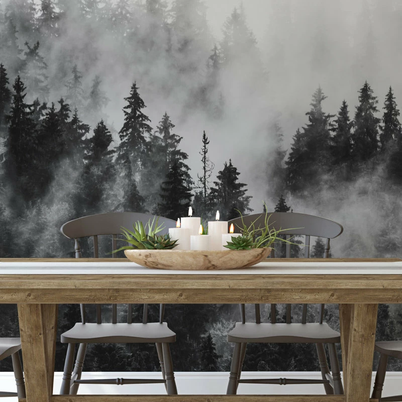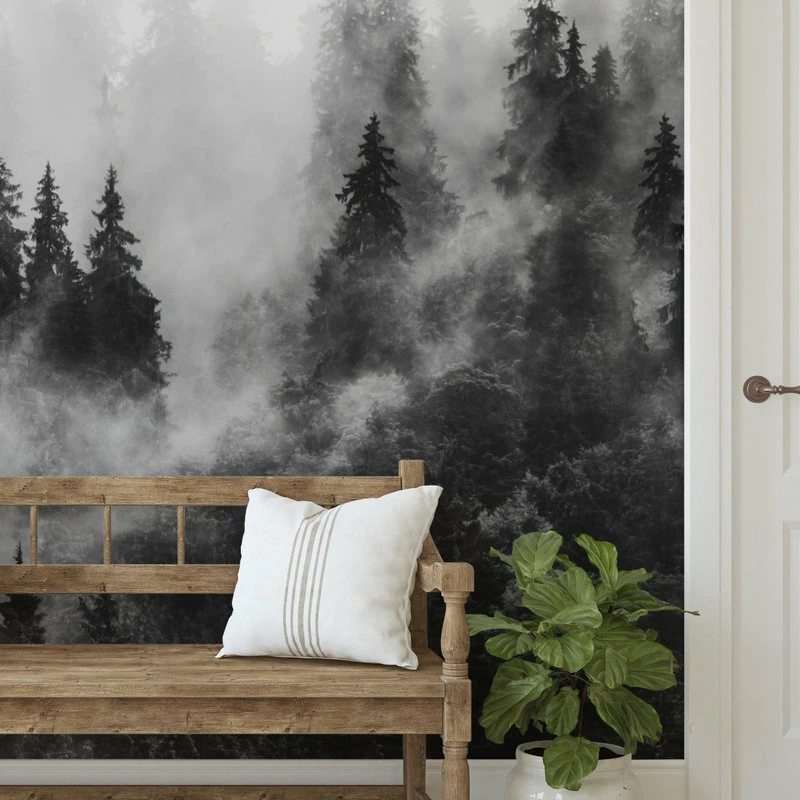 Our Morning Forest Fog Mural Wallpaper provides a misty overland forest view. A perfect ecoland backdrop.