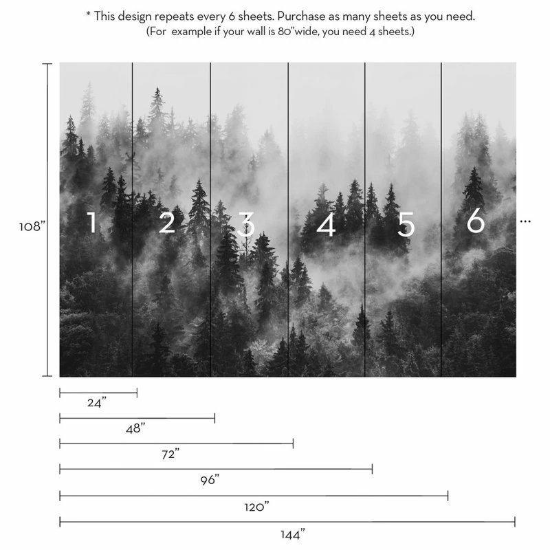 The overall pattern repeats every 6 sheets. Each sheet is sold individually, so you would order the amount that you need to fill your wall space. For example, if you have a wall that is 8 feet wide, you would need to order 4 sheets (you will receive sheets 1 through 4 as shown in the illustrated diagram).