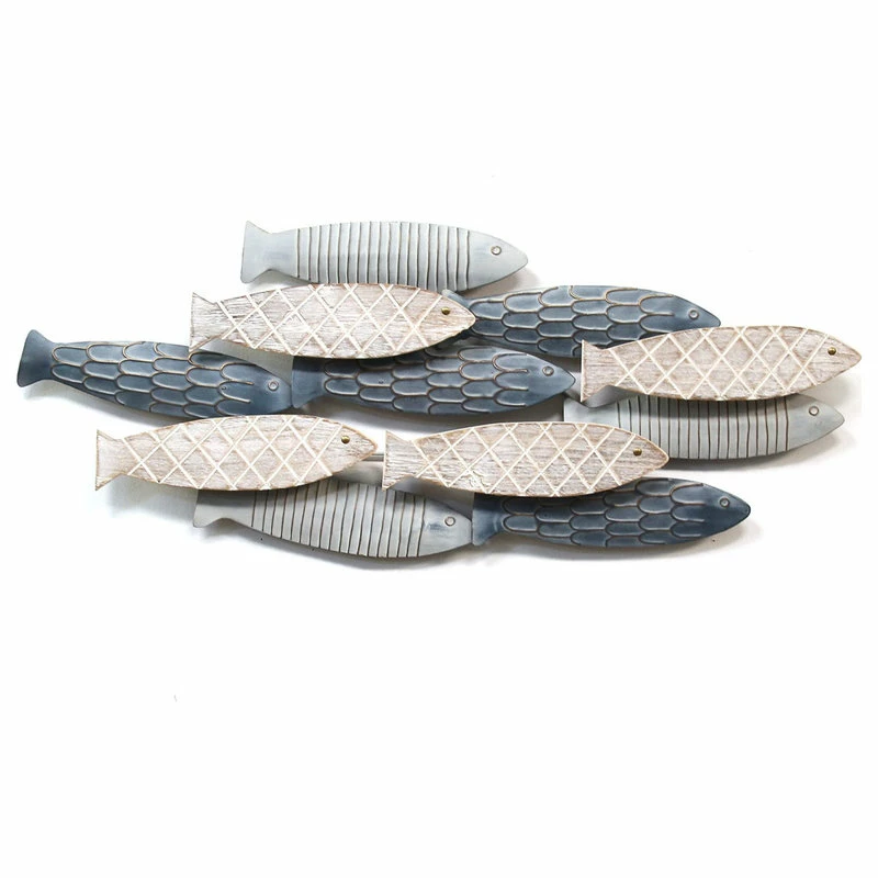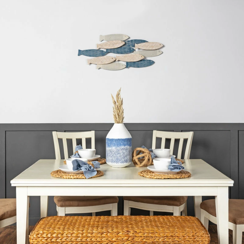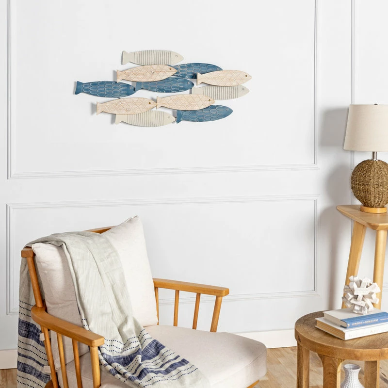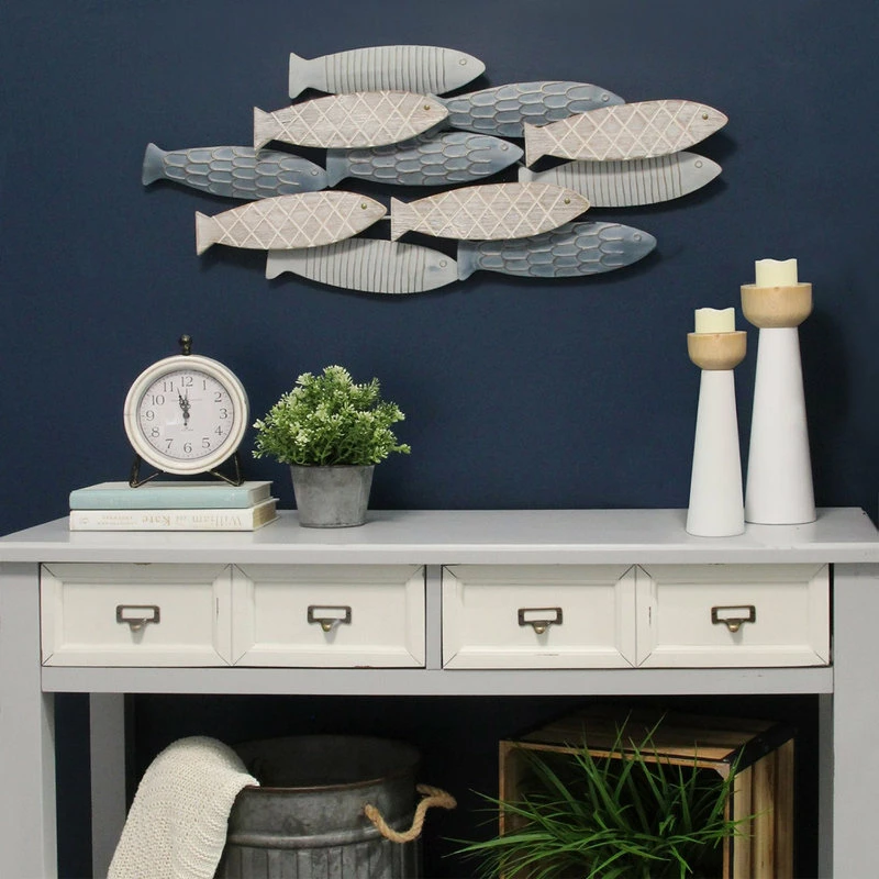 Enjoy the tranquil mysteries of the ocean with the School of Fish Wall Decor by Stratton Home. Made of wood and metal, this handcrafted array of fish in soft grey, white, and blue hues adds a soothing splash of color and dimensional beauty to any wall. It measures 35.5″ W X 2.5″ D X 15″ H and comes ready to hang for easy installation.