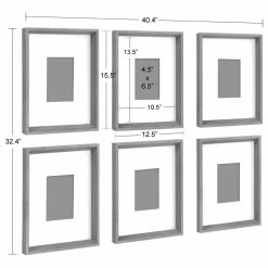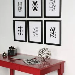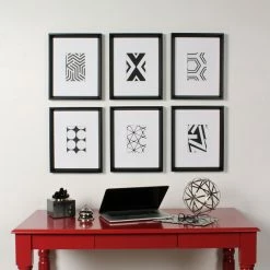Create a stunning wall gallery in your home with this gorgeous set of 6-piece black and white framed prints each with a different geometric pattern. Each print is framed with a crisp white beveled mat and protective glass. Each frame has a wall footprint that measures 12.5 inches by 15.5 inches and is 1.5 inches deep, while the art print is 4.5 inches wide by 6.5 inches tall and the glass is 10.5 inches wide by 13.5 inches tall. A hanging template is included, which allows you to easily arrange a display of three frames across and two frames high making the approximate outer dimensions 40.4 inches across and 32.4 inches high. This eye-catching modern art set is the perfect addition to your modern home wall gallery.