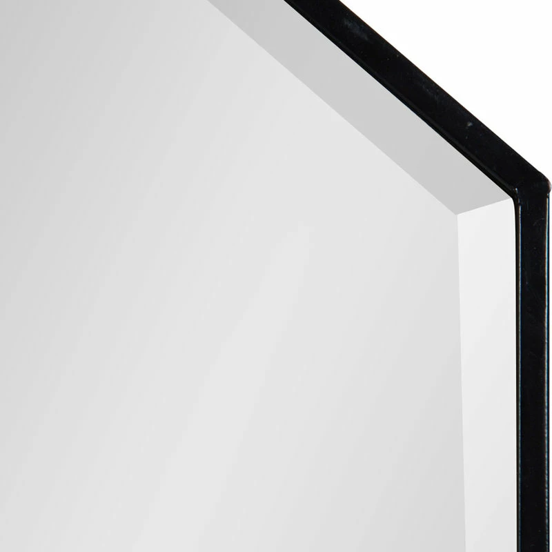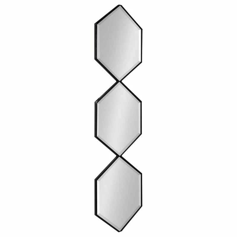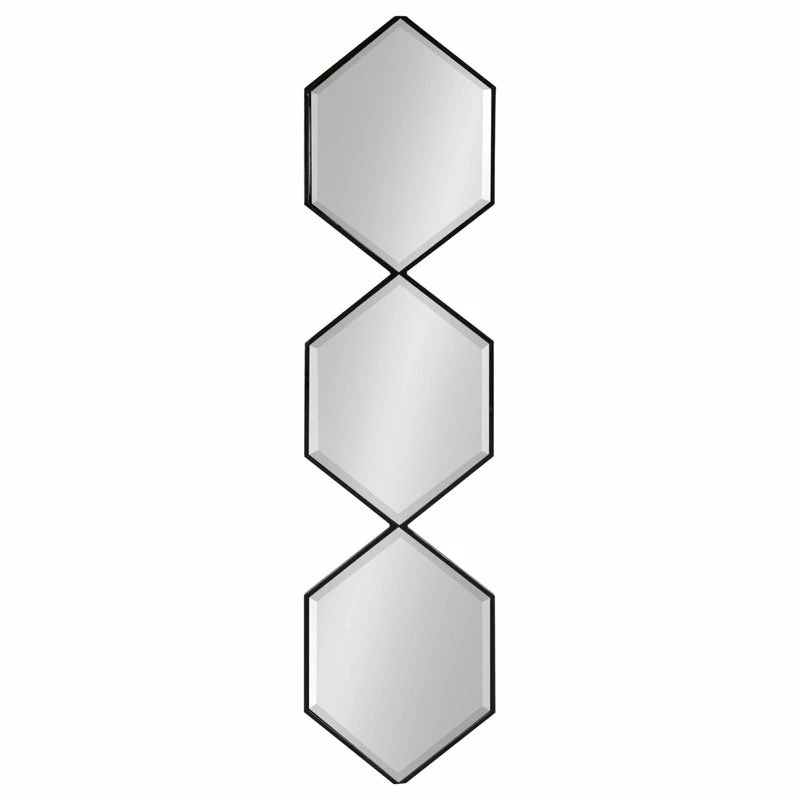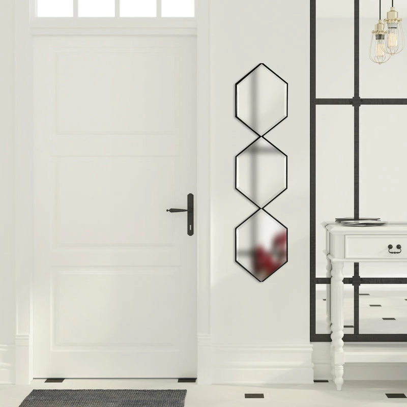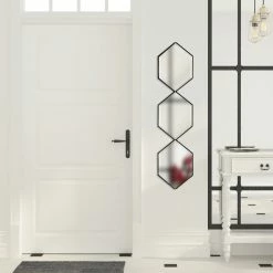 - Three sleek metal hexagons are lined up together in this modernly designed accent mirror. It will look fantastic hanging in an entryway, hallway or any wall that needs a bit of pop