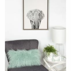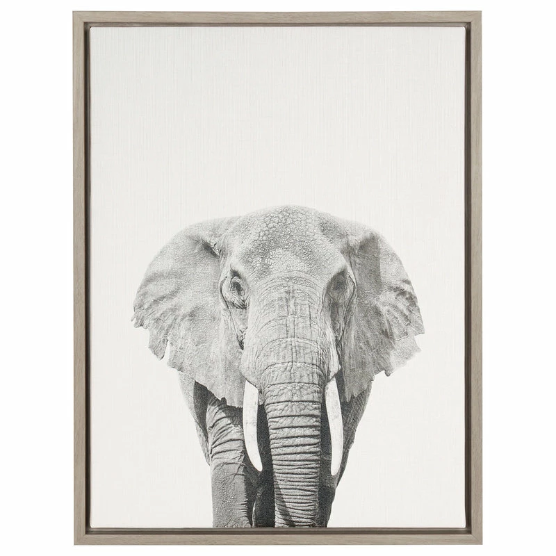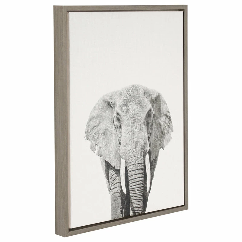 Bring the beauty of nature in its pure form and display your love of animals in your home with this striking elephant portrait. Printed and framed in the USA in Waunakee, Wisconsin, this framed floating canvas art will be a pleasure to look at every day in your living room, bedroom, nursery, or any room in the home. Printed on gallery wrapped canvas and framed with a gray polystyrene frame, this animal wall art has two hangers already attached to the black MDF back for easy wall display. The outer dimensions are 24 inches tall by 18 inches wide by 1.5 inches deep.