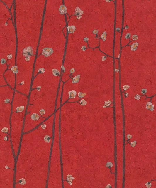This wallpaper is a contemporary take on Van Gogh’s “Flowering Plum Orchard” painting. Plum branches with delicate blooming flower buds seamlessly grow up the wall while texture mimicking oil brush strokes create a realistic effect.