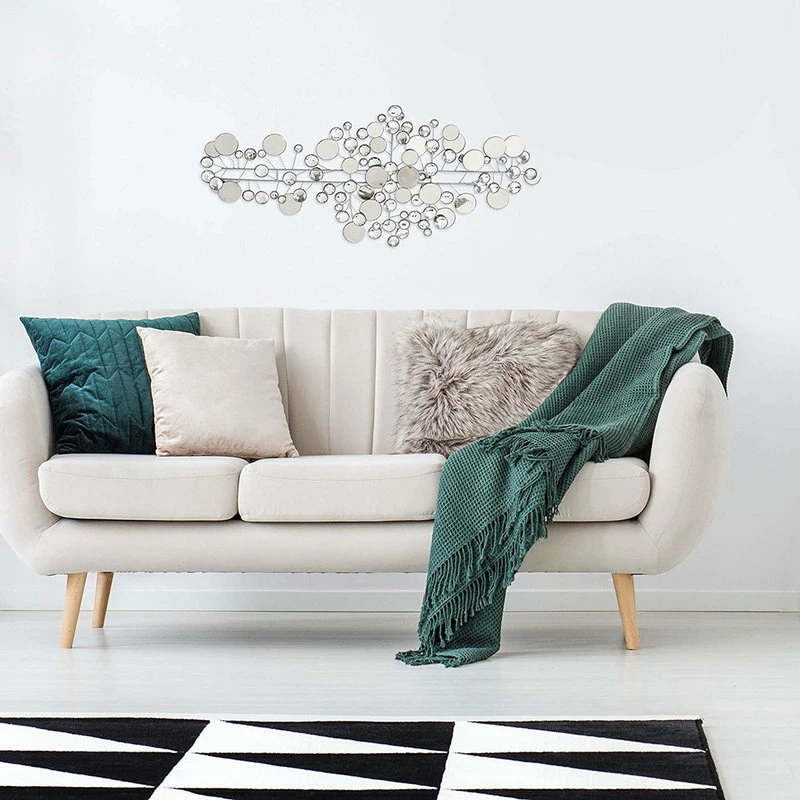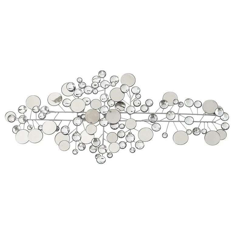 Evoke effervescence energy as you add reflective light and depth to your walls with the Modernist Floating Circles wall art. Contrasting discs of silver framed mirrors and sparkling faux diamonds are placed on intersecting metal rods together for an intricate fusion of harmonious shapes.