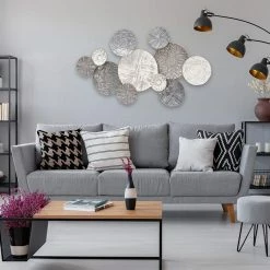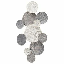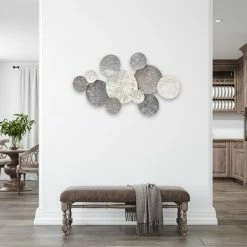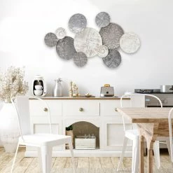 Visually rhythmic, this statement wall art decor is comprised of eye-catching white washed and grey roundels that feel rustic yet modern at the same time.